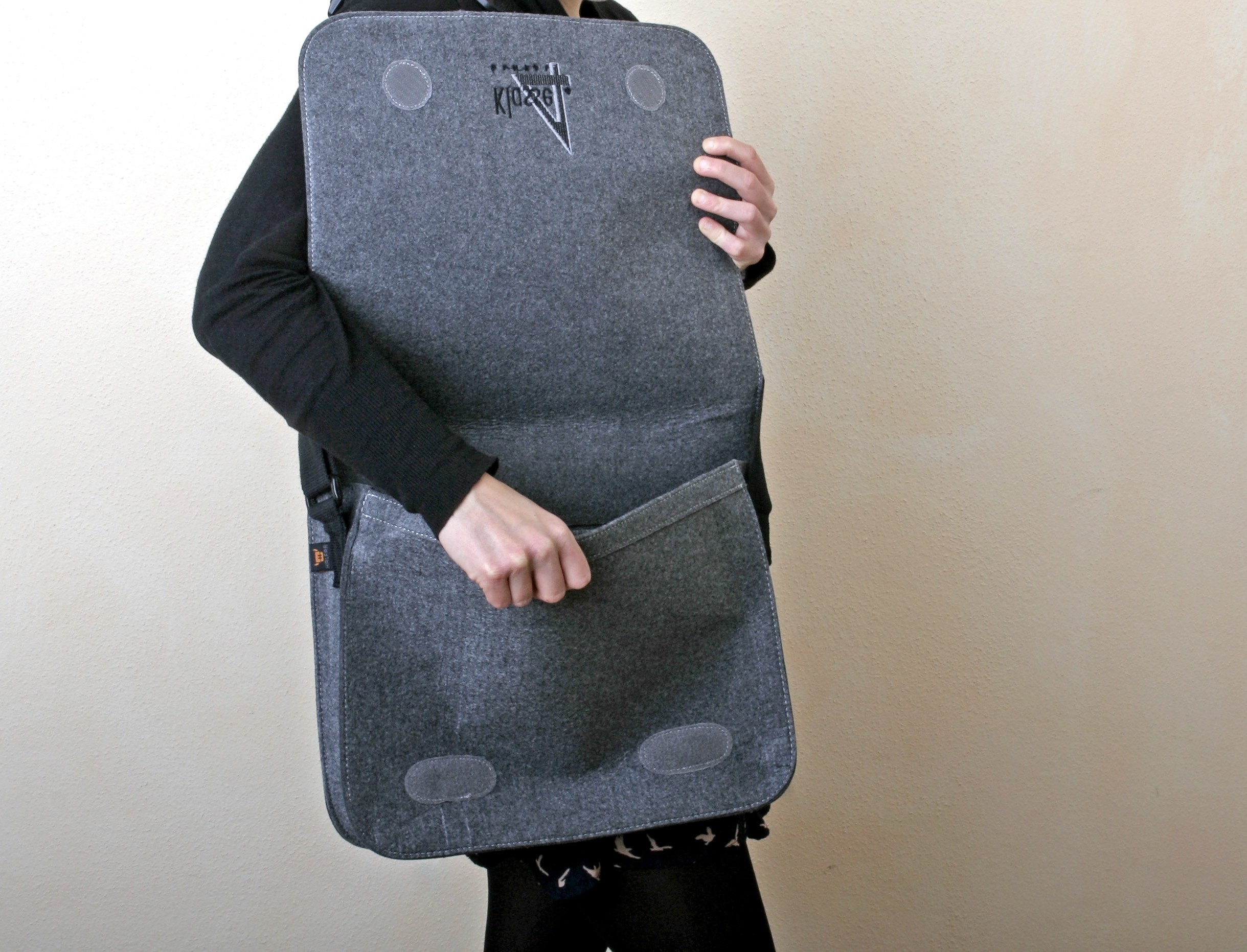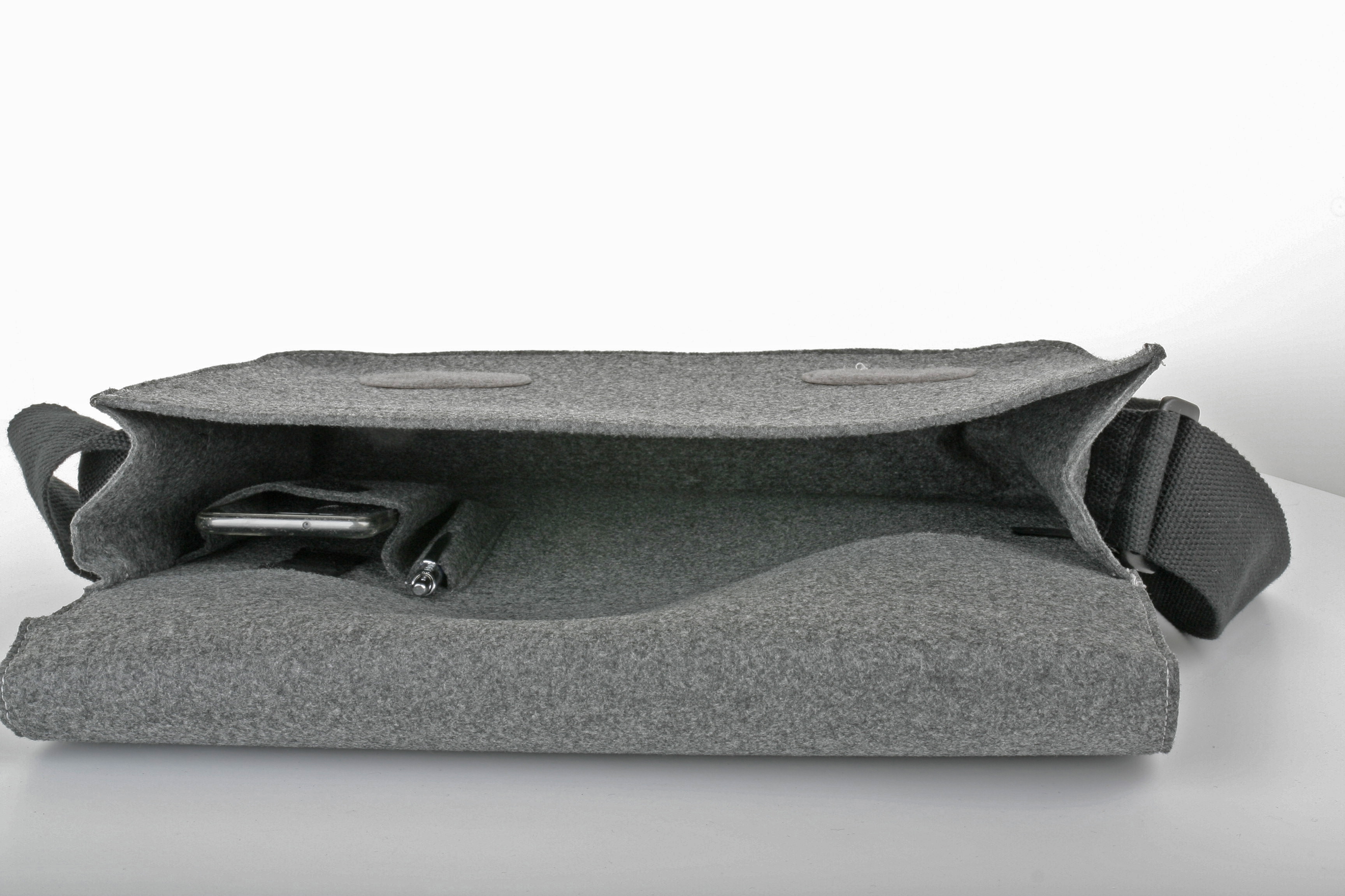 Klassische Kuriertasche aus Filz mit breitem verstellbarem Baumwollgurt und Organizer innen.